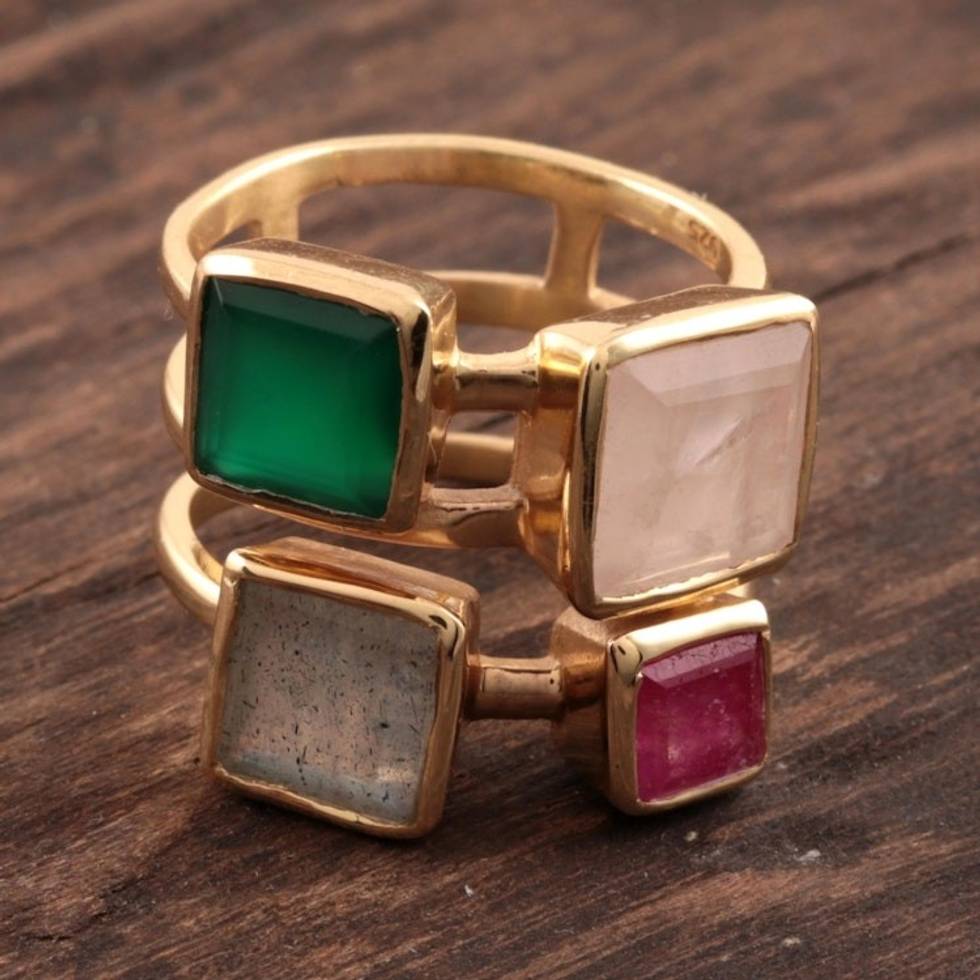 Gold Plated Multi-Gemstone Cocktail Ring from India 'Sparkling Squares' Item ID: 2671789543