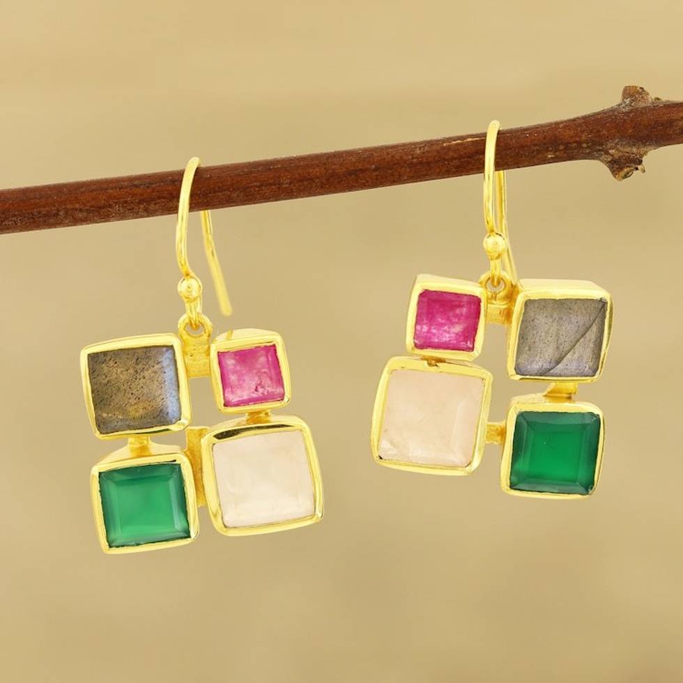 Gold Plated Multi-Gemstone Square Dangle Earrings from India 'Vibrant Frames' Item ID: 2671789994