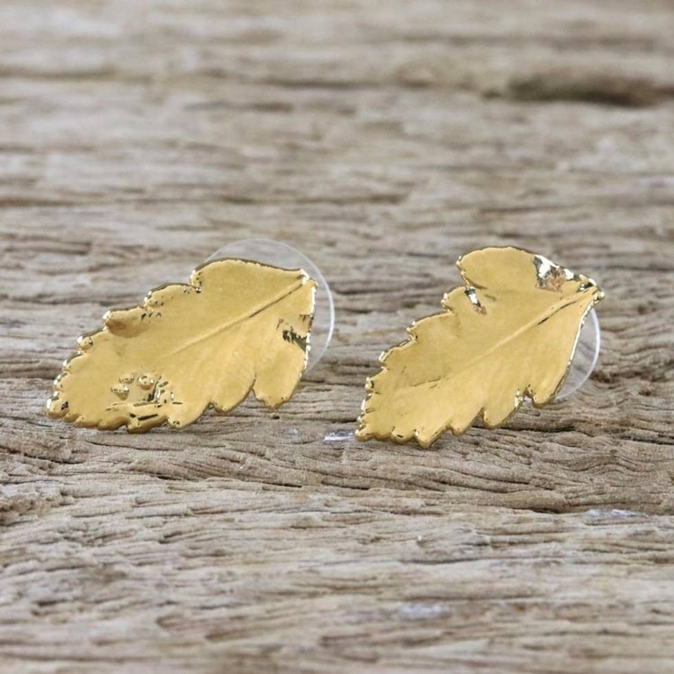 Gold Plated Natural Davallia Leaf Earrings from Thailand 'Shining Fern' Item ID: 2671801465