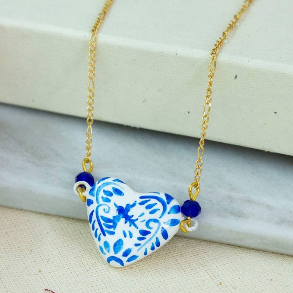 Gold-Plated Papier Mache Talavera Style Heart Necklace 'Blue Talavera Heart' Item ID: 2671798653