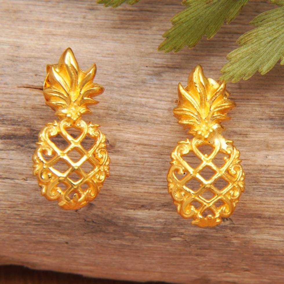 Gold-Plated Pineapple Button Earrings Made in Bali 'Pineapple Flair' Item ID: 2671764571