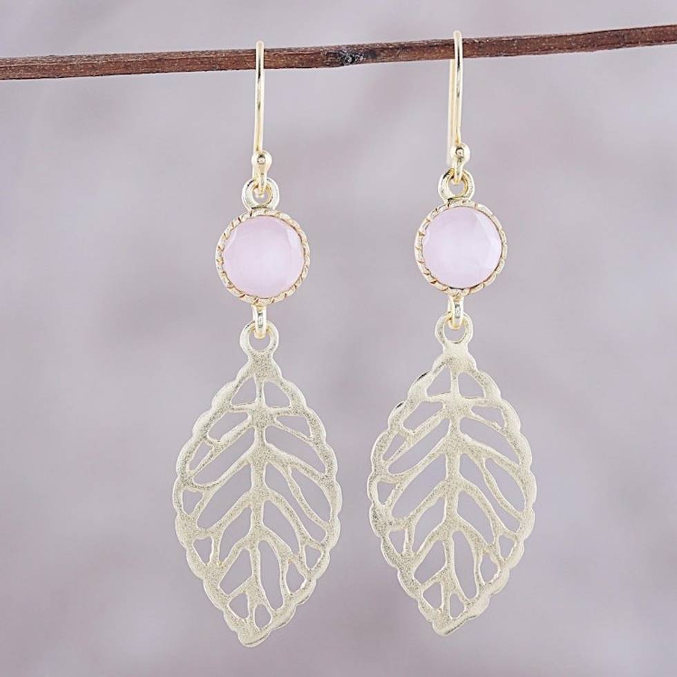 Gold Plated Rose Quartz Leaf Earrings from India 'Jaipur Leaves' Item ID: 2671792813