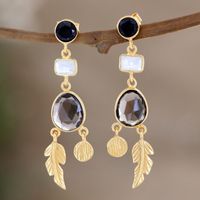 Gold-Plated Smoky Quartz and Black Onyx Dangle Earrings 'Winter Leaves' Item ID: 2671788198