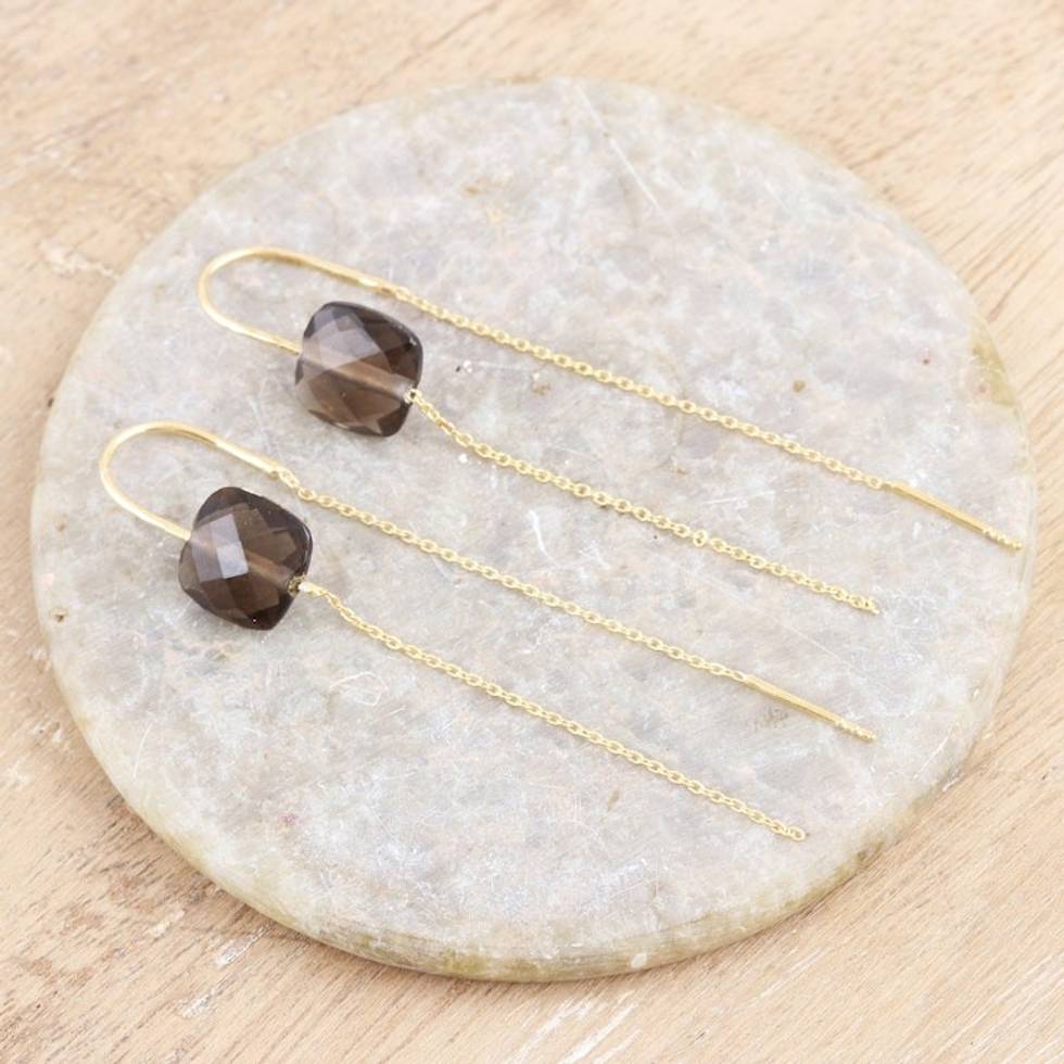 Gold-Plated Smoky Quartz Threader Earrings 'Stylish Earth' Item ID: 2669924437