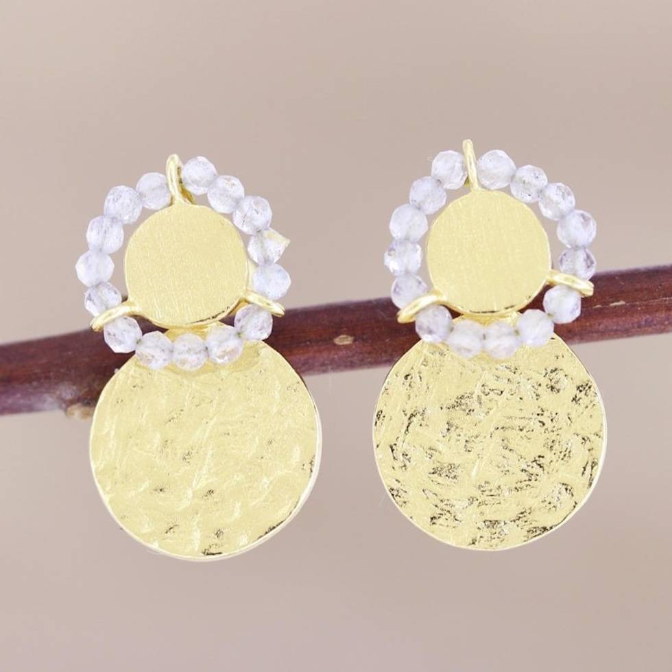 Beautifully paired with parsiolite the faceted labradorite moves and changes and looks lovely with an amazing array of clothing. Grays,blues, greens, even some orange hues. I love the varied and changing look of labradorite! My earrings are a bit lighter in color than other labradorite that I own which just adds to the interest. Neetu's work is beautifully conceived and I love the delicate design of the earrings. The craftsmanship is pristine!