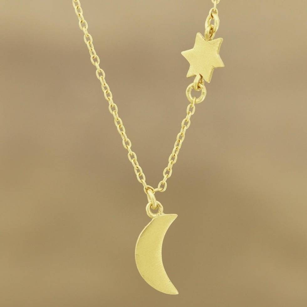 Gold Plated Sterling Silver Moon and Star Pendant Necklace 'Celestial Glisten' Item ID: 2669943005