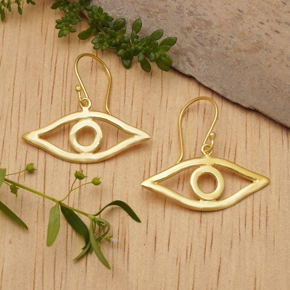 Gold-plated Whimsical Eye-Shaped Dangle Earrings from Bali 'Victorious Gaze' Item ID: 2671584578