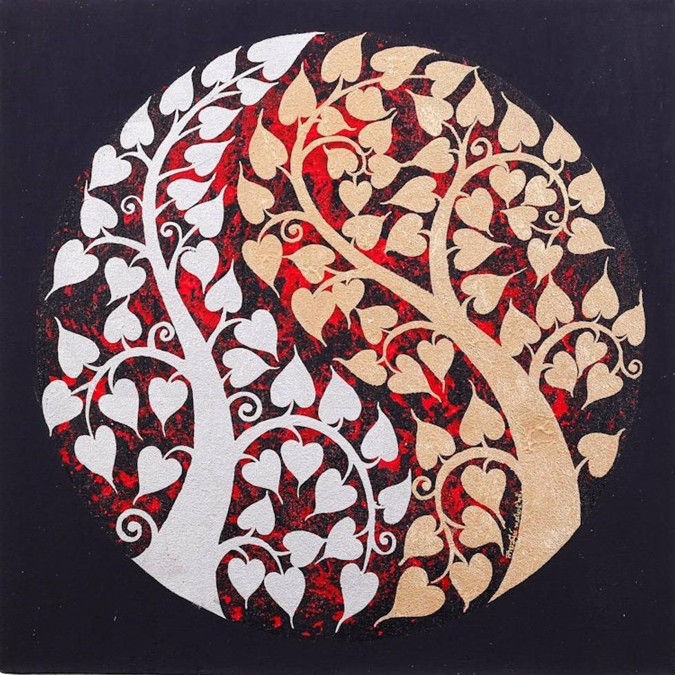 Gold Silver Traditional Thai Art Painting on Red 'Ying Yang Bodhi' Item ID: 2669888953