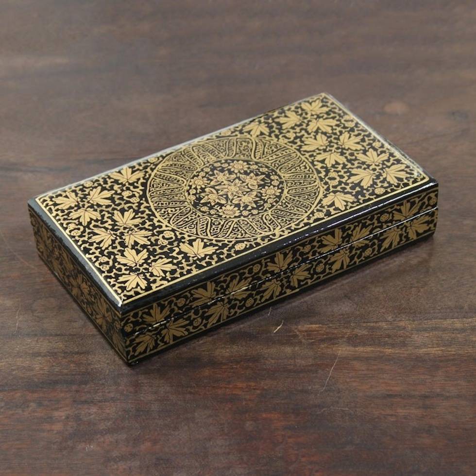 Gold-Tone Leaf Motif Papier Mache Decorative Box from India 'Midnight Golden Leaves' Item ID: 2671792368