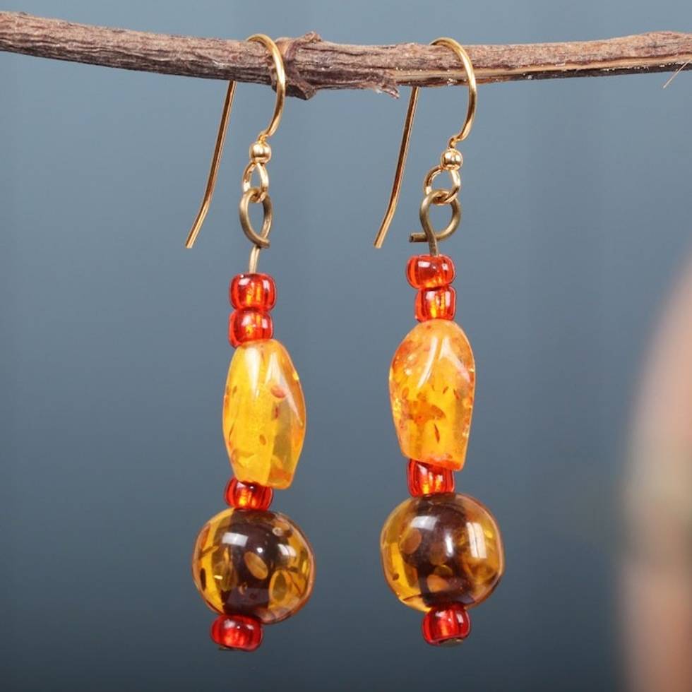 Golden and Red Recycled Glass Beaded Dangle Earrings 'Fire Essence' Item ID: 2671804104