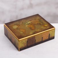 Golden World Map Reverse-Painted Glass Wood Decorative Box 'Cartographer's Treasure' Item ID: 2671399687