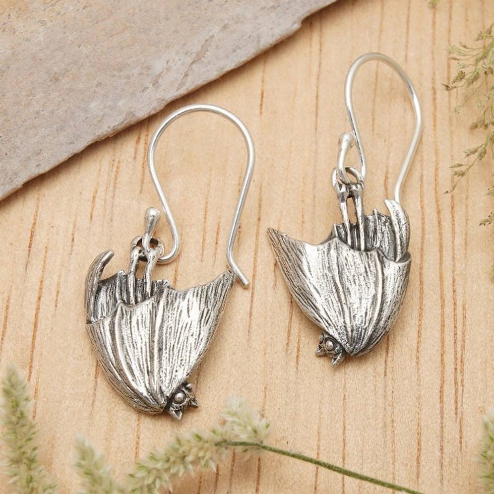 Gothic-Inspired Bat-Shaped Sterling Silver Dangle Earrings 'Nocturnal Spirit' Item ID: 2671765117