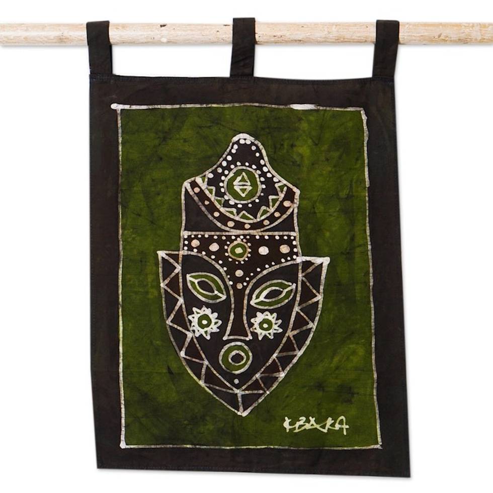 Green African Mask Cotton Wall Hanging from Ghana 'Human Gaze' Item ID: 2671804000