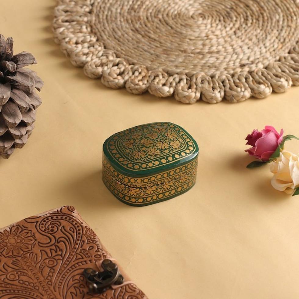 Green and Gold Papier Mache Decorative Box from India 'Graceful Viridescence' Item ID: 2671790858