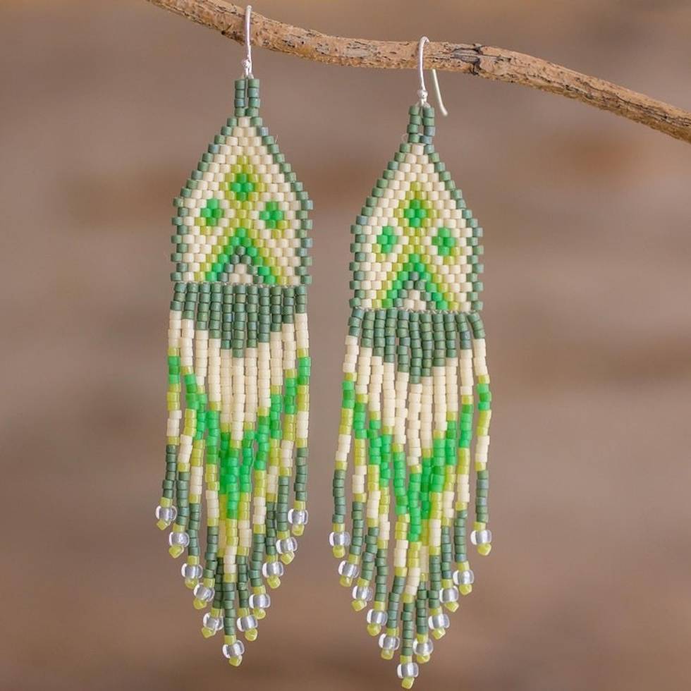 Green and Ivory Woven Bead Waterfall Earrings 'Peaks and Valleys in Green' Item ID: 2671779905