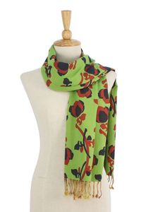 "Thai artisan Jamriang creates this gorgeous cotton scarf in a cool shade of spring green. Abstract floral motifs are screen printed in red and black pattern the scarf, which features a solid saffron back. The lovely soft scarf has neat multi-colored fringes at either end which complete the vibrant design."