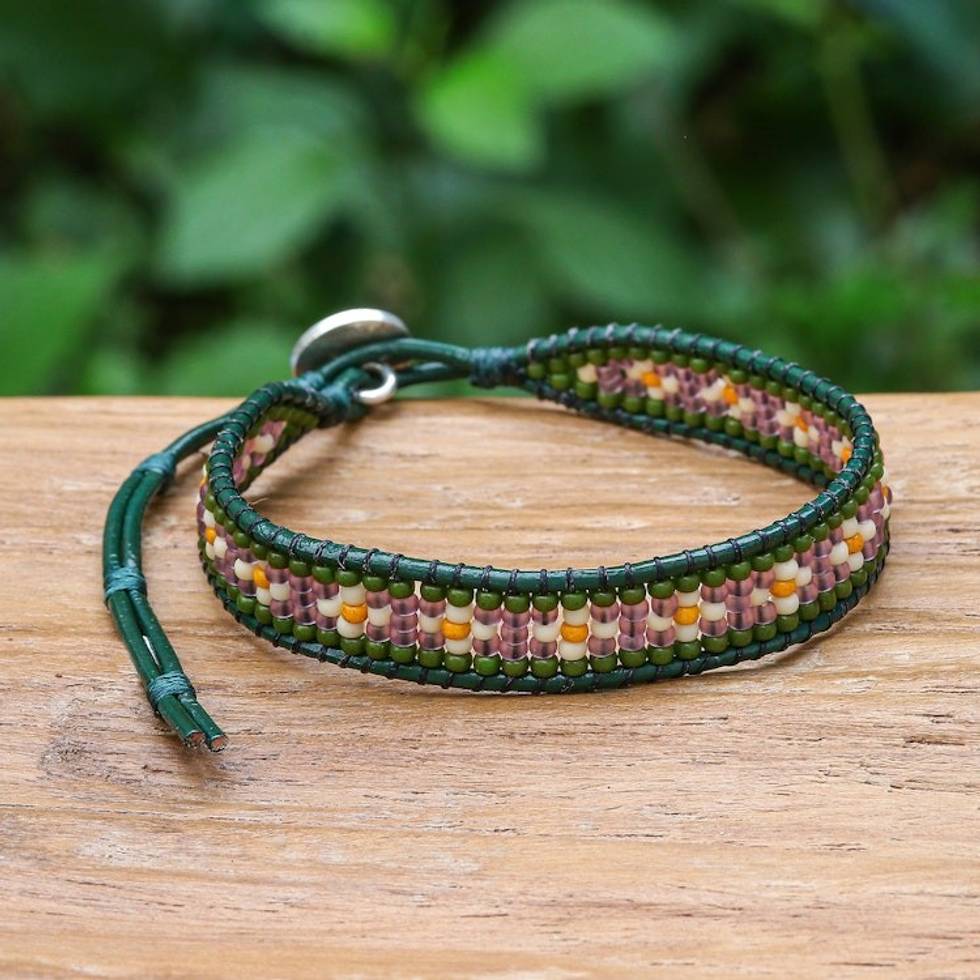 Green and Purple Glass Bead and Leather Wristband Bracelet 'Peace at the Forest' Item ID: 2671796542