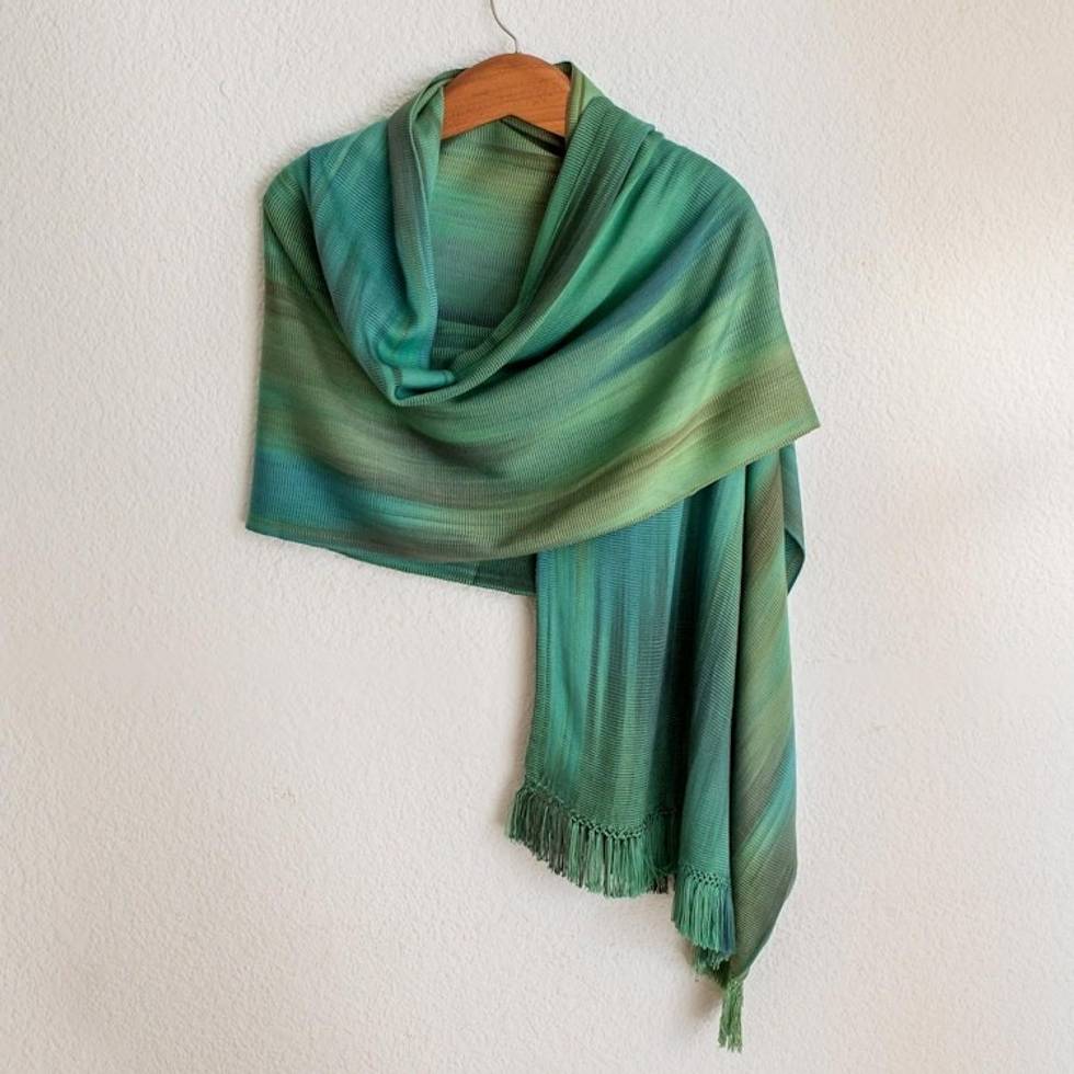 Green and Turquoise Hand Woven Rayon Shawl 'Peaceful' Item ID: 2671626676