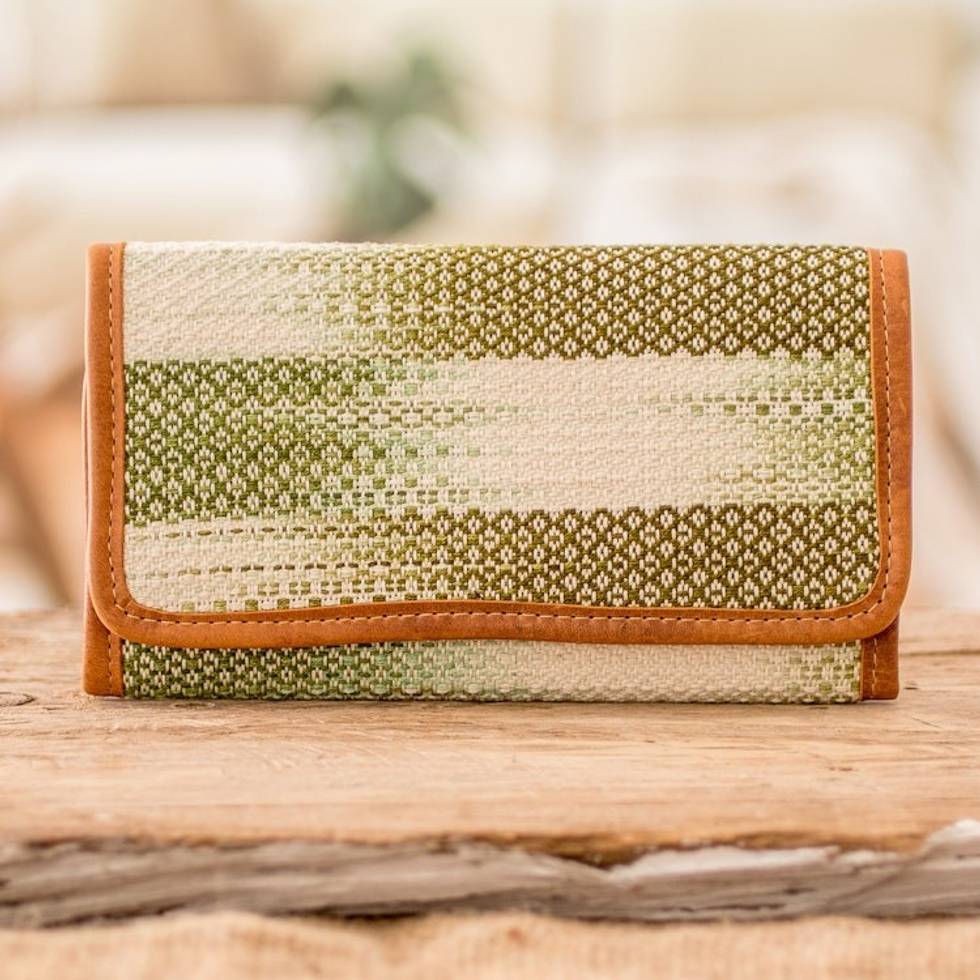 Green and White Hand-Woven Cotton Wallet with Leather Trim 'Colors of Tradition in Green' Item ID: 2671769777