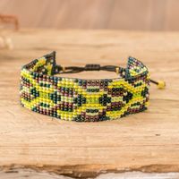 "Green and yellow hues unite to create this geometric-patterned wristband bracelet, made to symbolize good luck. Guatemala's Hands Of Atitlan Association crafts this sublime accessory in a masterful display of artistry, all using glass beads for a radiant look. The piece is also equipped with a sliding knot that allows for adjustable length."