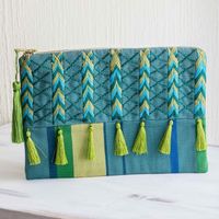 "Turquoise cotton fabric, woven by hand, hosts zigzag motifs in green and blue. Members of the Maya Artists Group demonstrate their skill with a lovely cosmetic bag. Embellished with hand embroidery done with a punch-needle technique, the front flaunts green tassels. A tassel also adorns the zipper, and the bag is fully lined.
