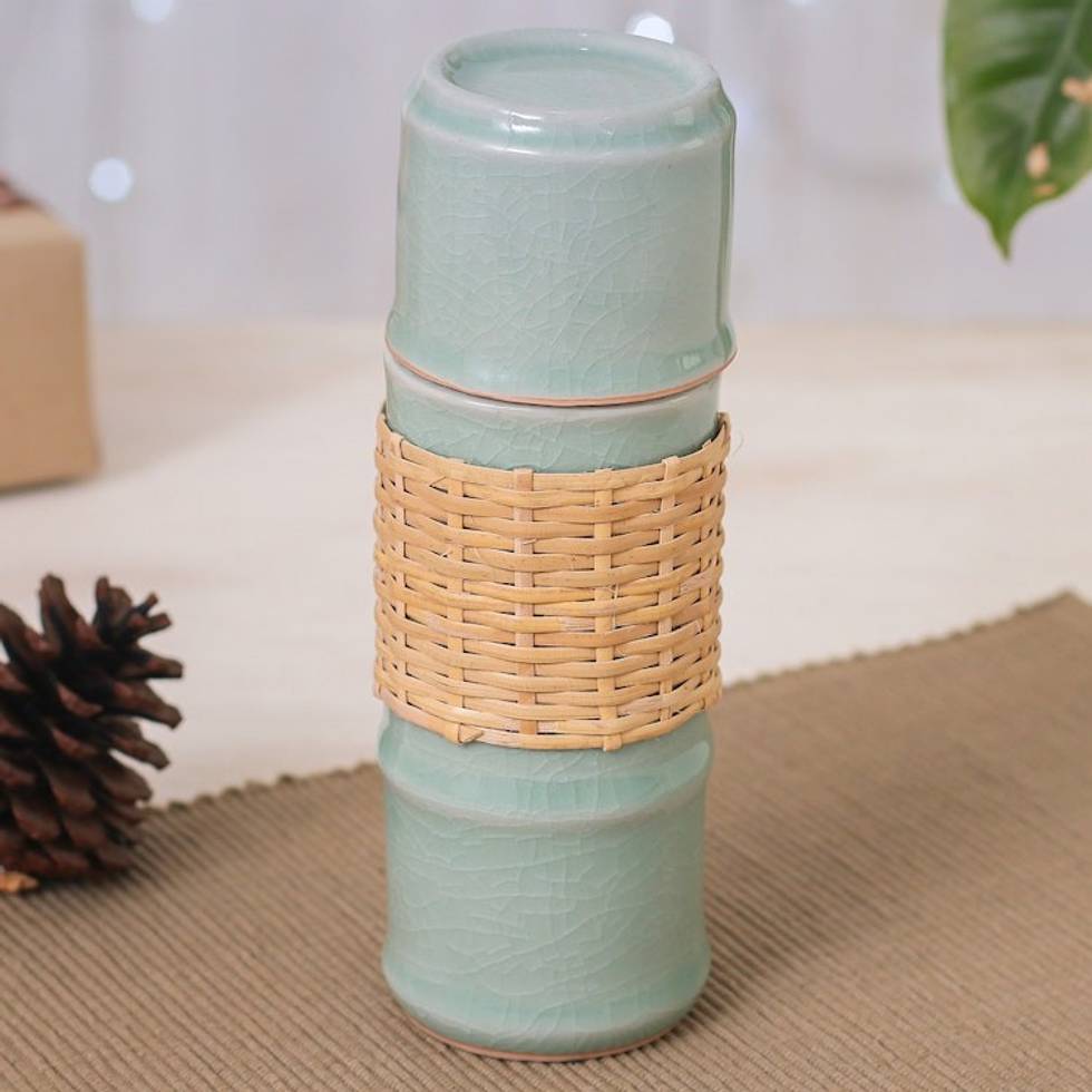 Green Celadon Ceramic and Rattan Bamboo-Themed Water Bottle 'Green Bamboo' Item ID: 2671797750