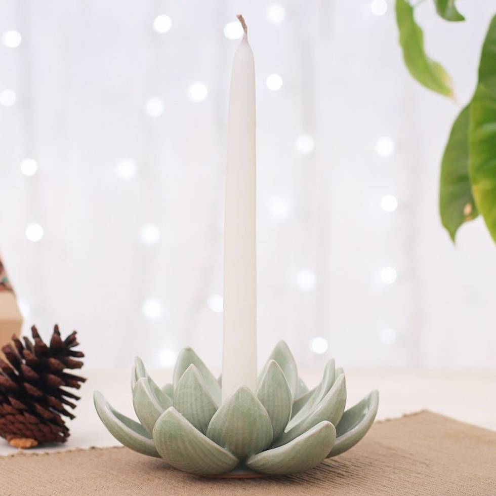 Green Celadon Ceramic Candle Holder with Lotus Flower Motif 'Lotus Splendor in Green' Item ID: 2671797251