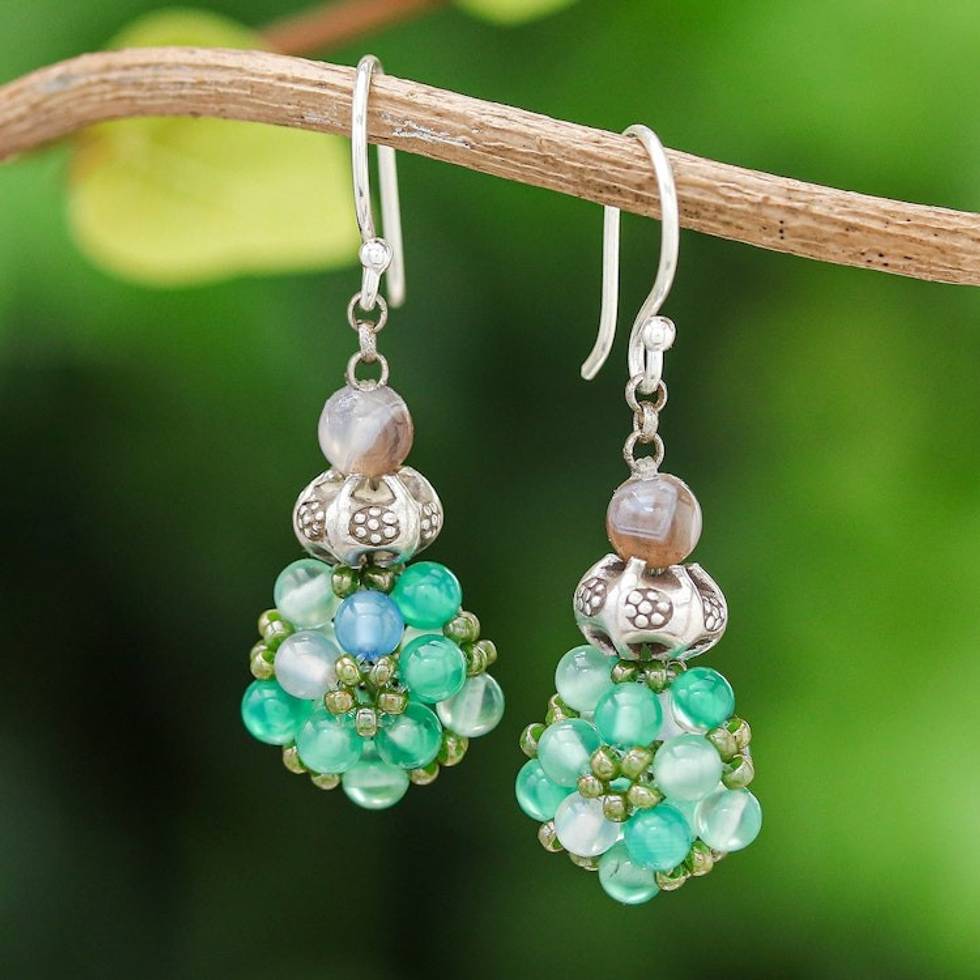 Green Chalcedony and Agate Cluster Beaded Dangle Earrings 'Breezy Spring' Item ID: 2671798115