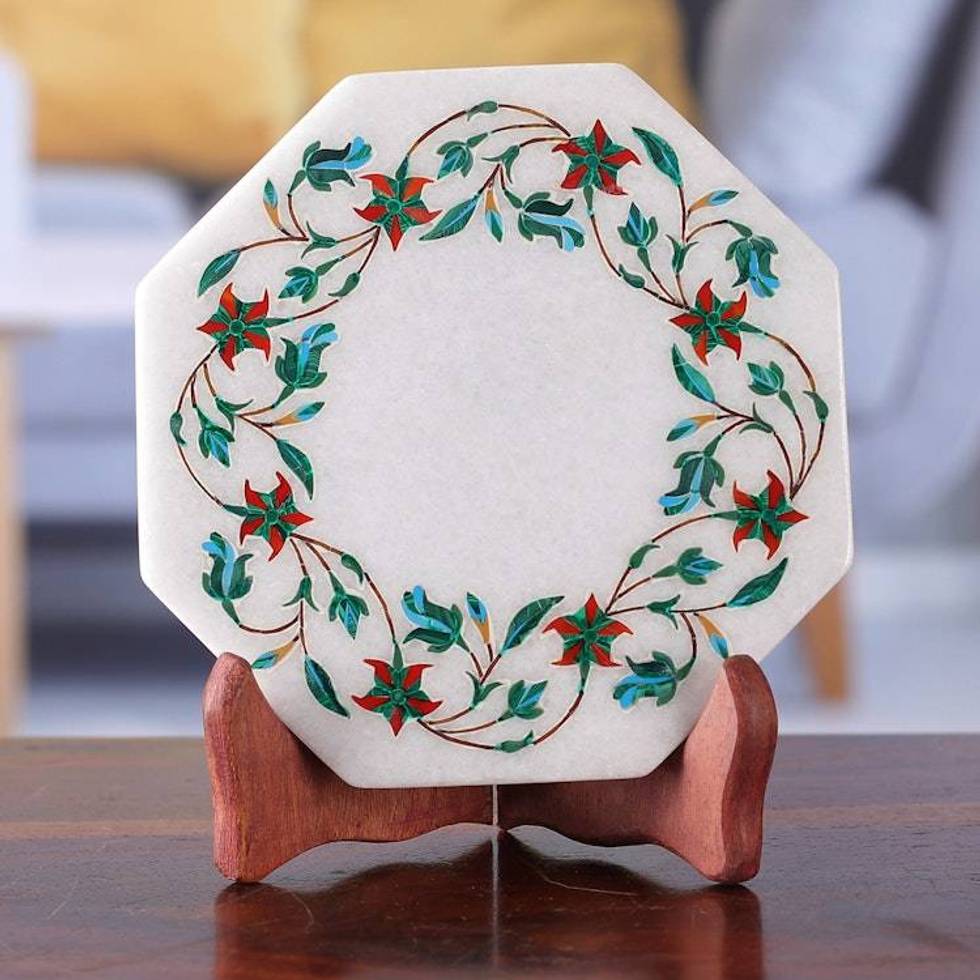 Green Floral Marble Inlay Decorative Plate from India 'Ivy Garland' Item ID: 2676663773