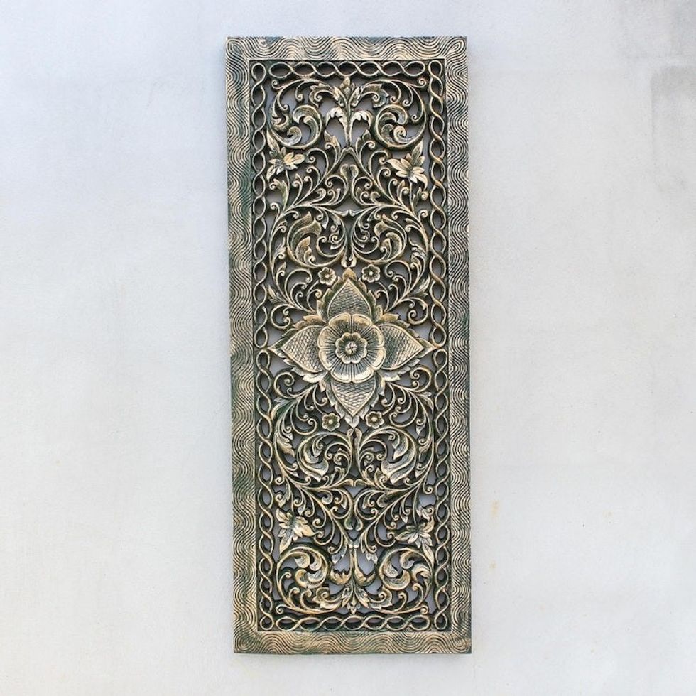 Green Floral Teak Wood Relief Panel from Thailand 'Imperial Blossom' Item ID: 2671798567