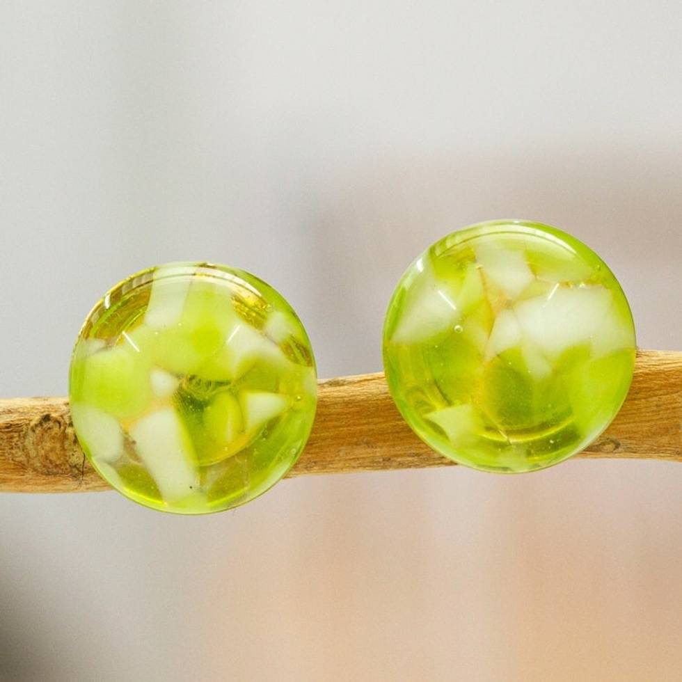 Green Fused Glass Mosaic Button Earrings from Mexico 'Green Textures' Item ID: 2671639012