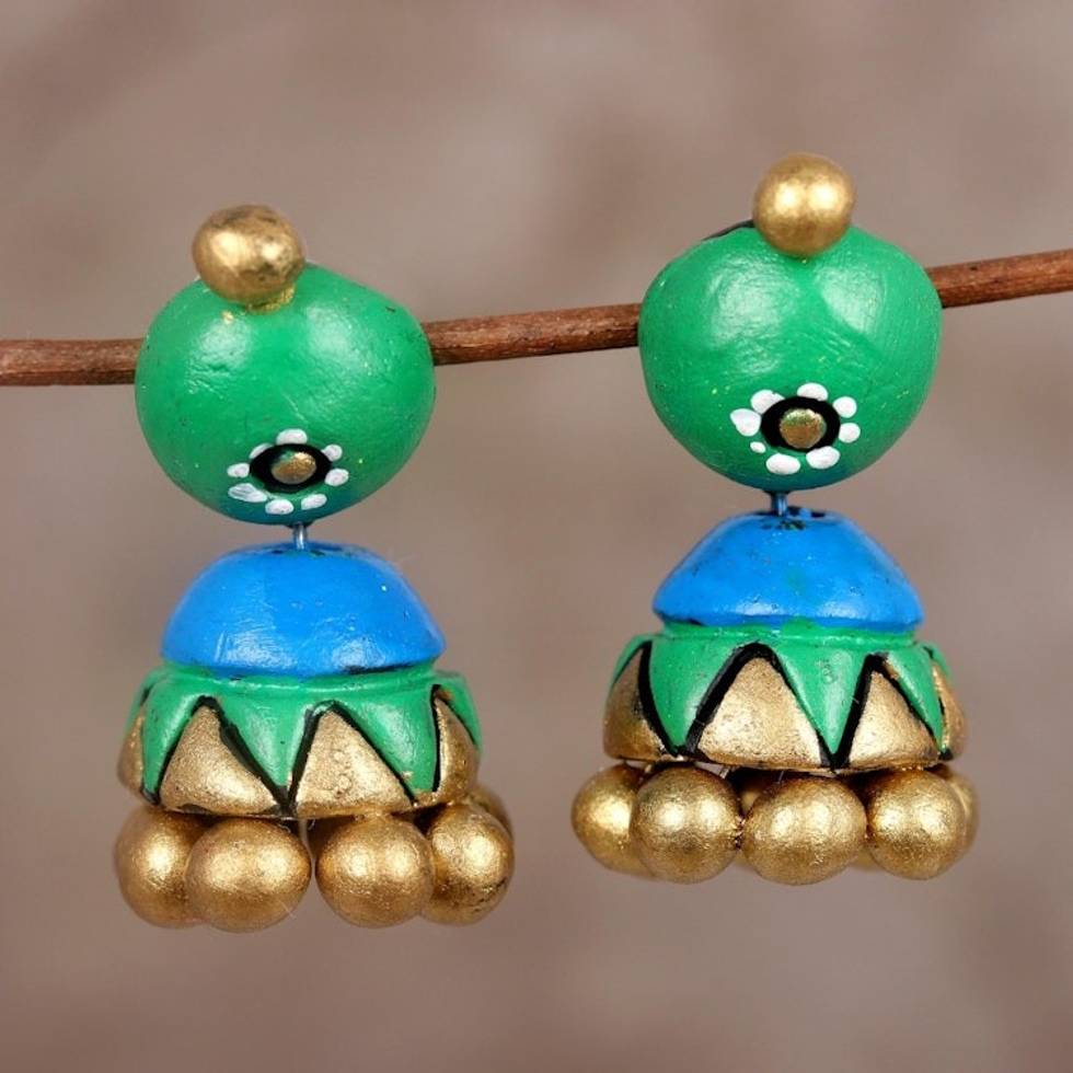 Green Gold and Blue Ceramic Jhumki Painted Dangle Earrings 'Verdant Harmony' Item ID: 2671790377