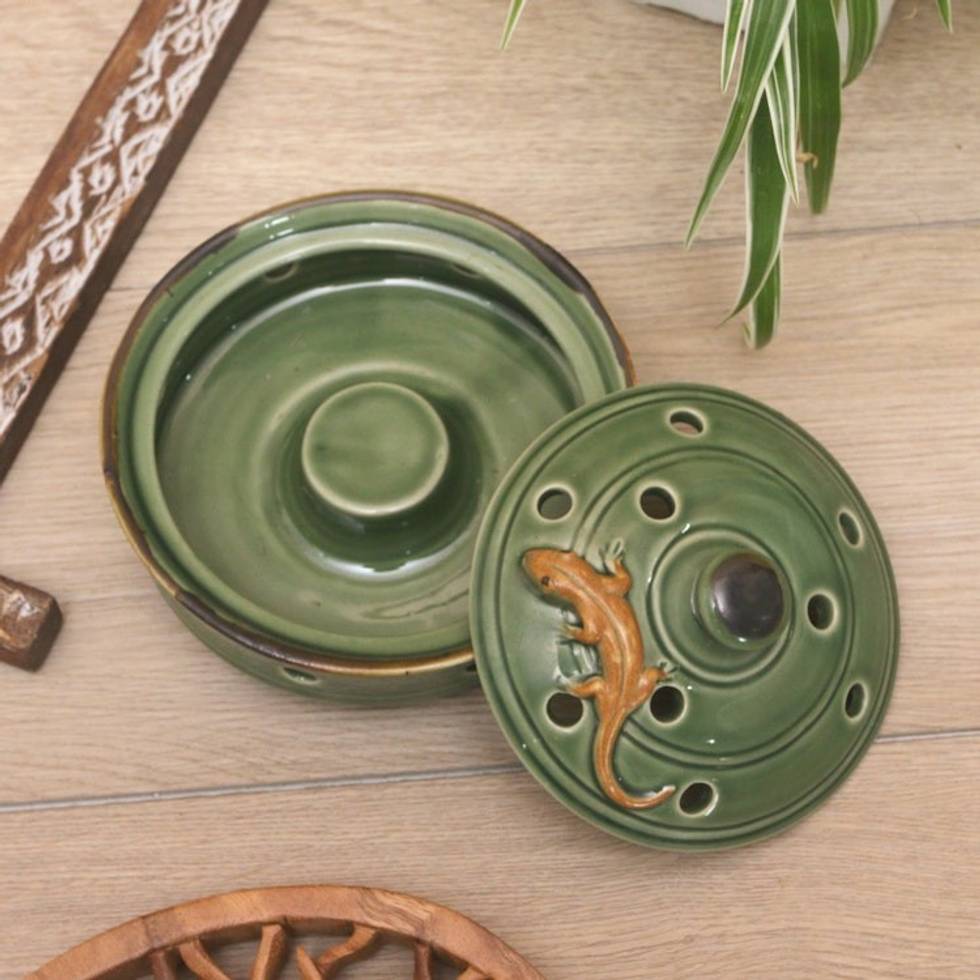 Green Handmade Lizard-Themed Porcelain Mosquito Coil Holder 'Lizard with Polka Dots' Item ID: 2671762994