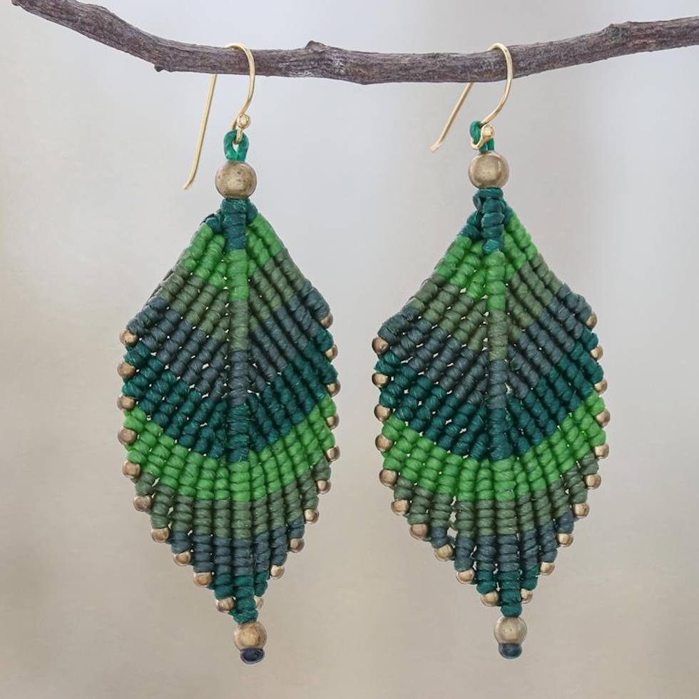 Green Leaf Waxed Cord Macrame Dangle Earrings 'Boho Leaves in Green' Item ID: 2671640796