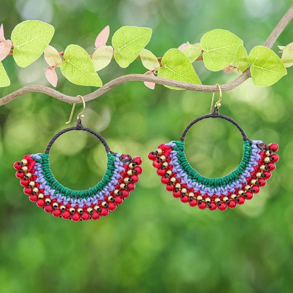 Green Macrame Dangle Earrings with Red Magnesite Beads 'Audacious Nimbus' Item ID: 2671798107