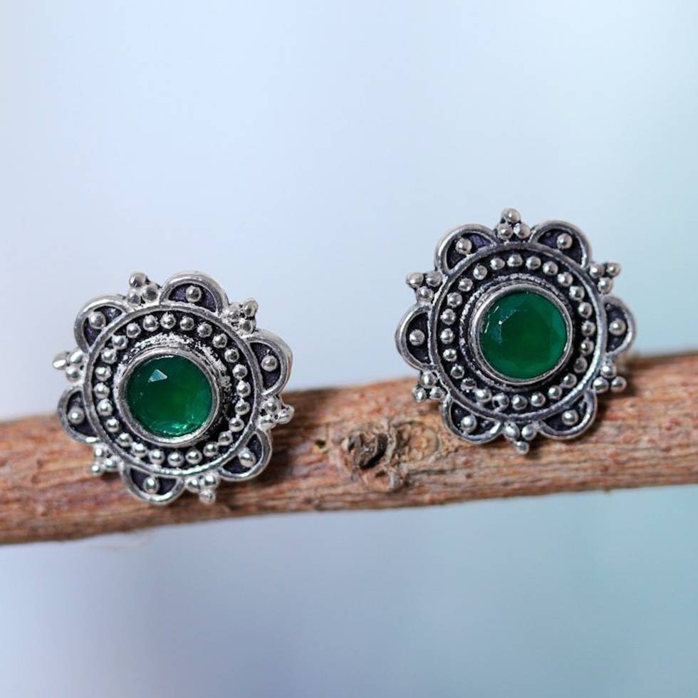 Green Onyx 925 Silver Button Earrings with Floral Motif 'Classic Green Blossom' Item ID: 2671786824