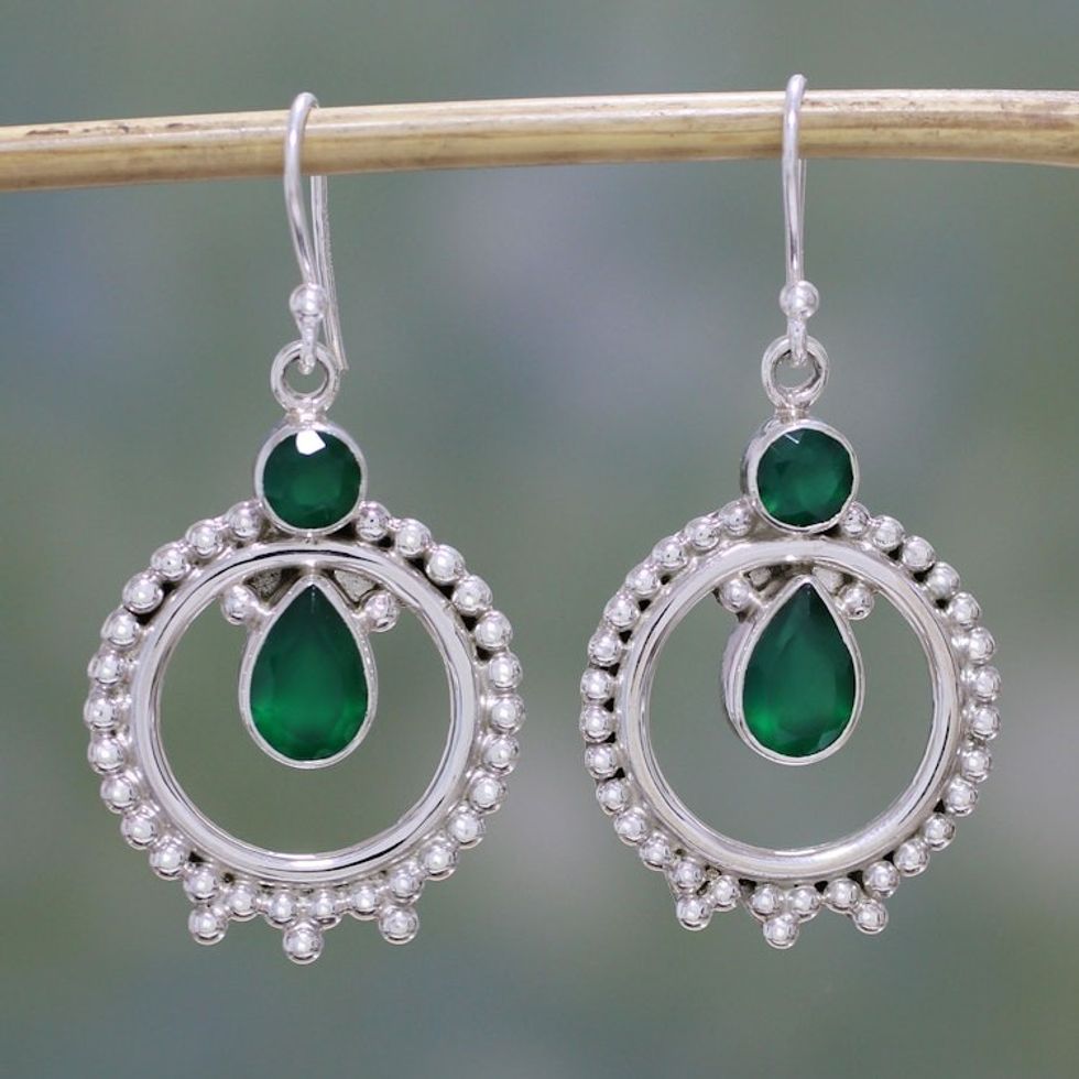 Green Onyx and Sterling Silver Dangle Earrings from India 'Regal Circles' Item ID: 2671791390