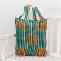 "To the beach or just to do a bit of shopping, this green plaid tote with patches of orange fringe is sure to get attention. The cotton fabric is handwoven on a backstrap loom and the straps are long enough for carrying by hand or on the shoulder. Designed by Emma Gutierrez, it is a modern interpretation of a pre-Hispanic weaving technique."