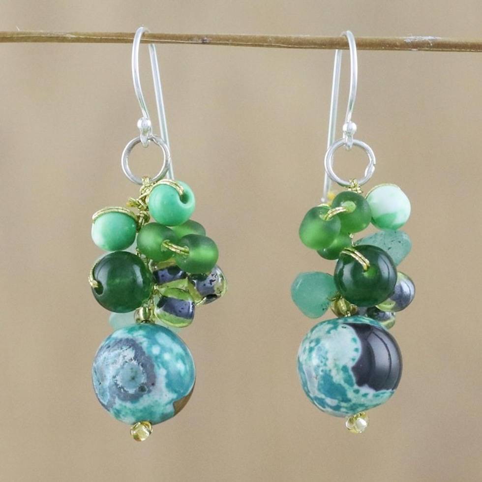 Green Quartz and Glass Bead Dangle Earrings from Thailand 'Lovely Blend in Green' Item ID: 2669929642
