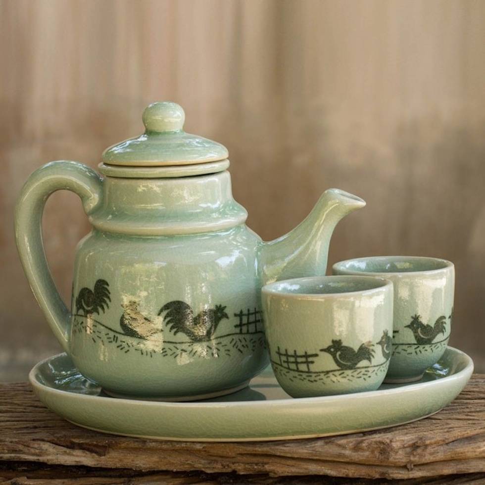 Green Thai Celadon Ceramic Tea Set for Two 'Cute Chicks' Item ID: 2671802139