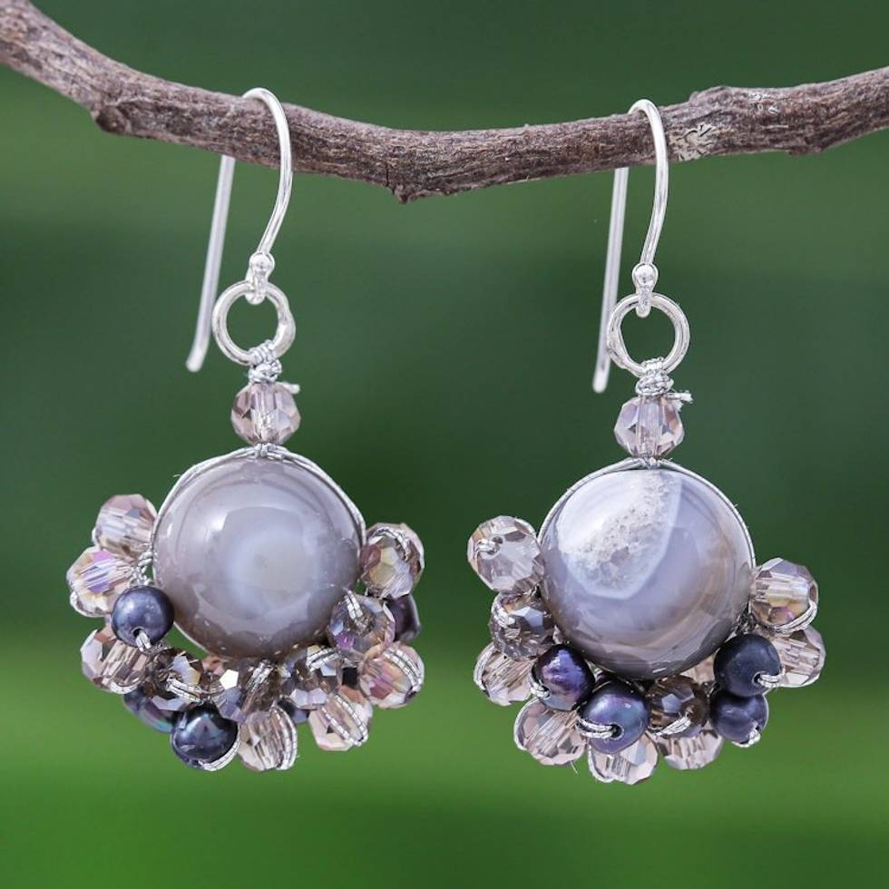 Grey Agate and Cultured Pearl Dangle Earrings 'Vivid Dream in Grey' Item ID: 2669927312