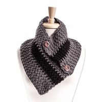 "Working with cotton and polyester blend yarns in flint grey and black, Martha Fonseca in Mexico crafts this cozy neck warmer. The collar-style neck warmer is crocheted by hand and features two wood buttons to secure it around the neck."