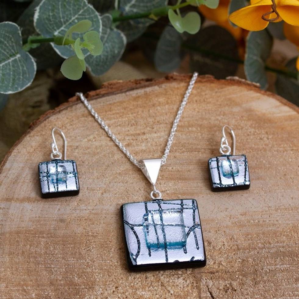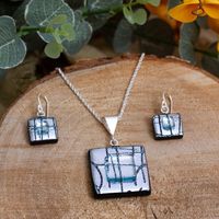 Grey and Blue Square Dichroic Art Glass Jewelry Set 'Heaven's Cube' Item ID: 2671807518