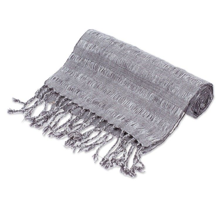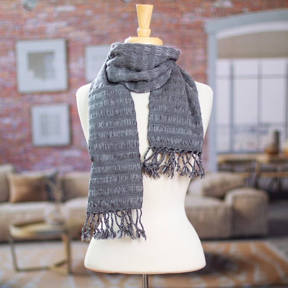Grey Cotton Scarf with Braided Fringes Handloomed in Mexico 'Grey Catwalks' Item ID: 2671807838