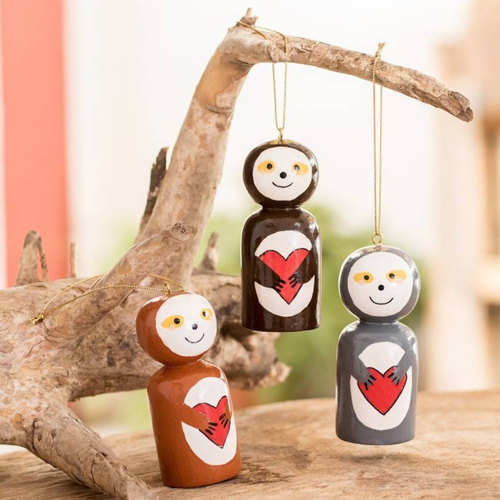 Guatemalan Handcrafted Reclaimed Wood Ornaments Set of 3 'Love Sloth' Item ID: 2671772313