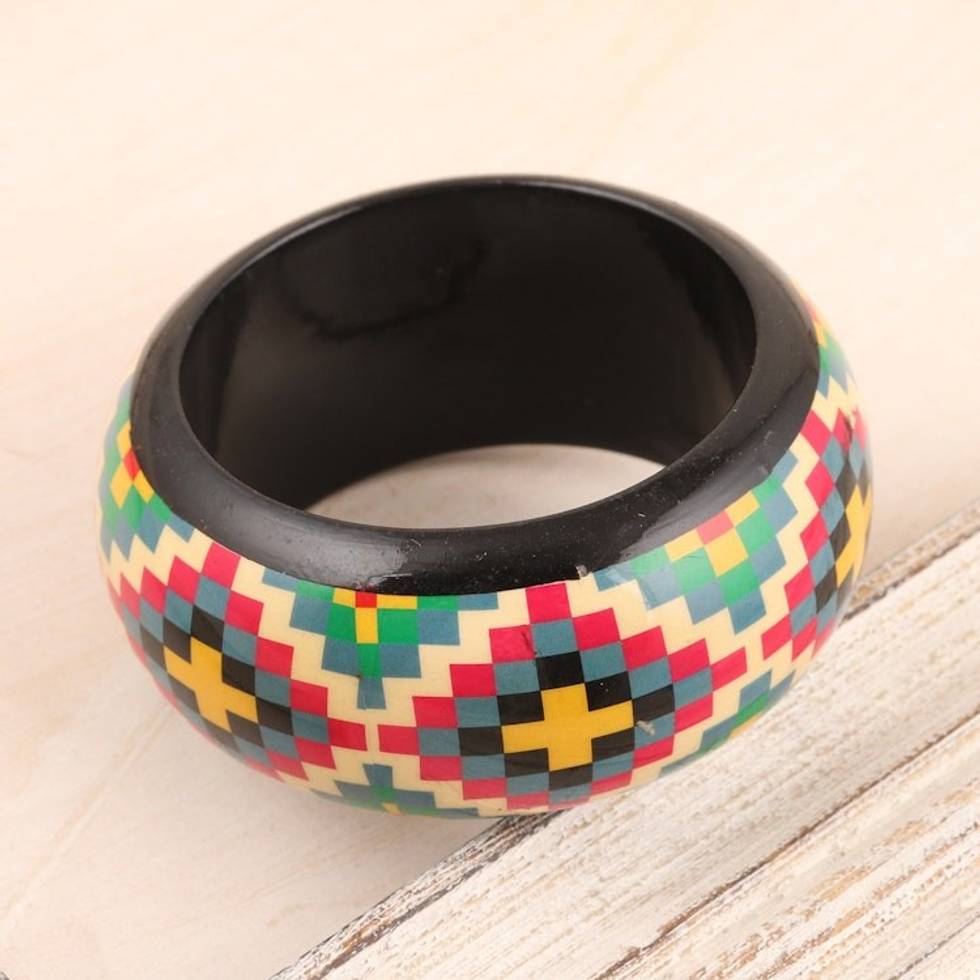 Haldu Wood Bangle Bracelet with Colorful Printed Pattern 'Checkered Stars' Item ID: 2671789134