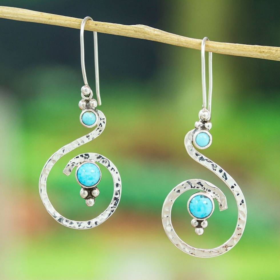 Hammered Sterling Silver Dangle Earrings with Turquoise Gems 'Sinuous Hope' Item ID: 2671807642