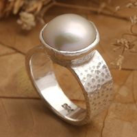 Hammered White Cultured Pearl Single Stone Ring from Bali 'Ocean's Nobility' Item ID: 2671764550