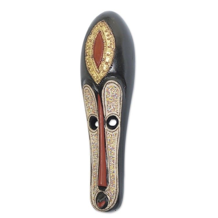 "A unique decoration goes hand in hand with high-quality works rich in culture and tradition, and Daniel Quarcoo's newest creation reunites all the requirements needed to make your environment a special place. Ghanaian artisans work with sese wood to create this African mask, decorating it with a vibrant palette, a brass plate and recycled glass beads for a captivating and eco-friendly touch."