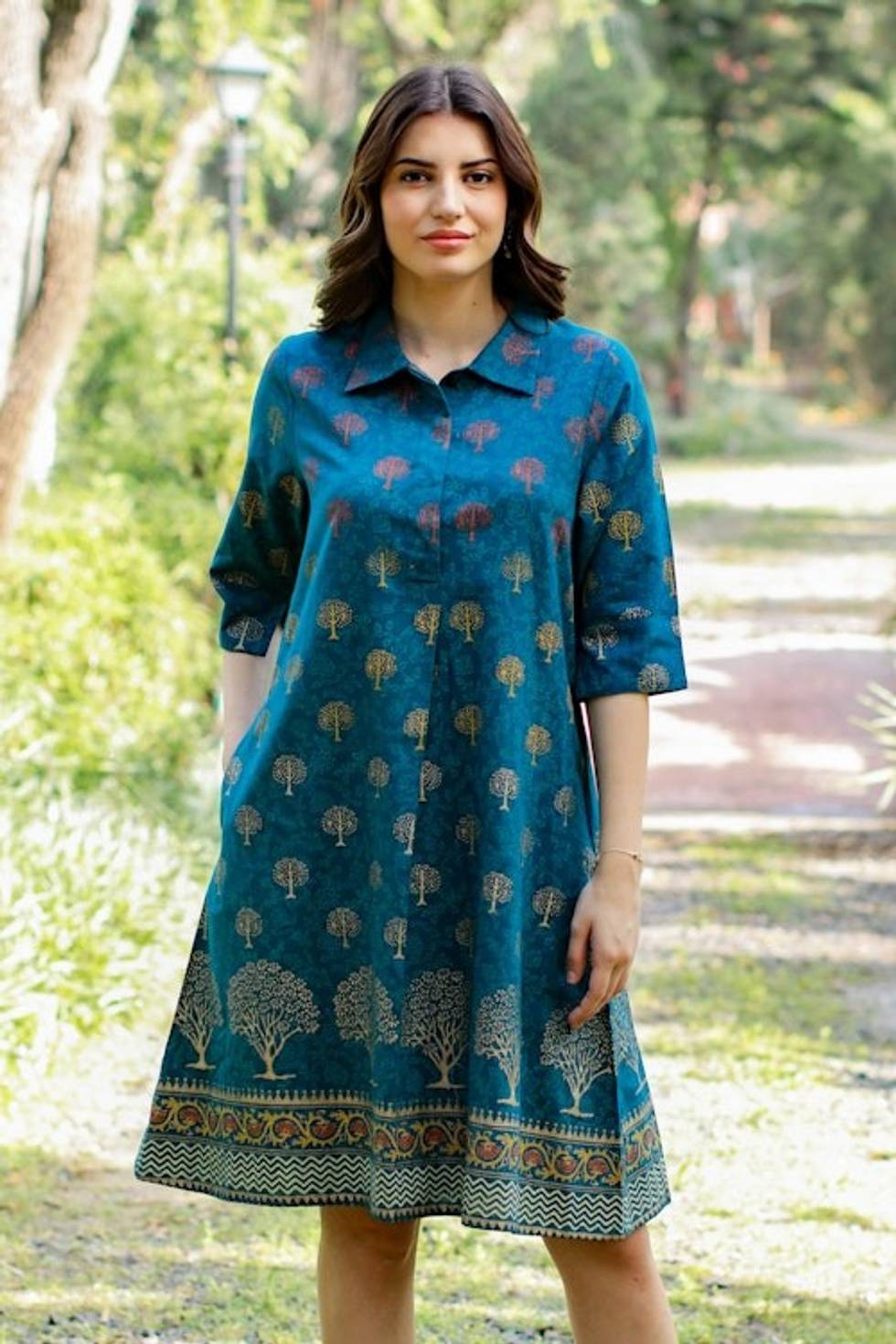 Hand Block-Printed Shirtdress 'Chanderi Garden' Item ID: 2669925087